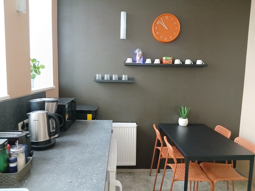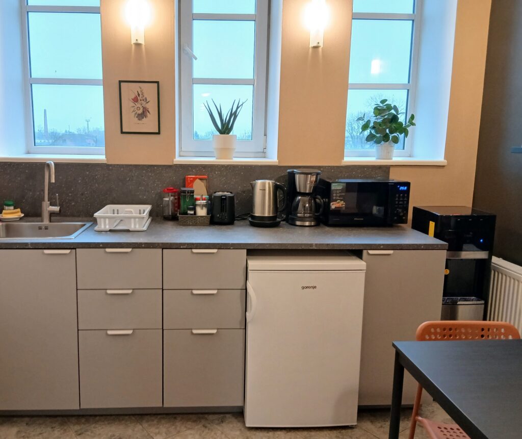 – Guests have access to a small kitchenette, where they can prepare light meals and hot drinks. A microwave, kettle, coffee machine, and toaster are available for use.